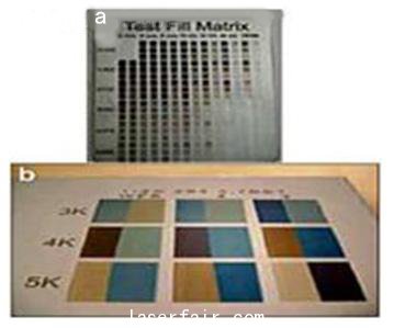 圖:利用光纖激光器在(a)SS304、(b)17-7不銹鋼材質(zhì)上獲得的打標(biāo)效果。