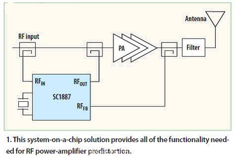 圖1:這種系統(tǒng)級芯片解決方案可以提供射頻功率放大器預(yù)矯正所需的所有功能