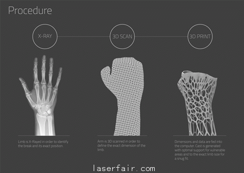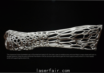 目前骨折康復(fù)輔助固定手段基本都是打石膏,如果你曾經(jīng)打過石膏,你一定印象深刻:不透氣,難聞,悶起來的皮膚瘙癢難耐,又厚又笨,很不方便。曾有打石膏體驗(yàn)的 Jake Evill 決心改變這一現(xiàn)狀,用3D打印技術(shù),創(chuàng)立了 Cortex cast 項(xiàng)目。簡單來說,就是通過X光確定病人骨折部位之后,3D掃描病人的對應(yīng)肢體部位,然后3D打印出一幅輕量的、透氣的能夠貼合肢體并提供有效支撐保護(hù)的框架式外殼。