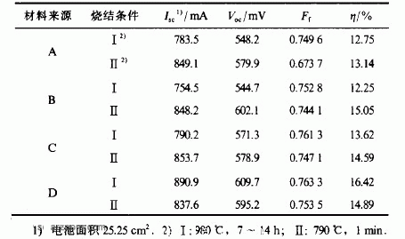 可以看到,經(jīng)高溫,長時間燒結(jié)的電池比經(jīng)低溫短時間燒結(jié)的電池其填充因子Ff都有明顯提高。說明這一燒結(jié)過程對改善歐姆接觸有良好的作用。然而,對采用A,B,C3種來源硅材料的電池來說,這以過程明顯降低了短路電流,開羅電壓而且抵消了Ff的增益,使轉(zhuǎn)換效率明顯下降。而對D材料則完全不同,長時間的高溫燒結(jié)使3 個指標都有所改善,明顯提高了轉(zhuǎn)換效率。