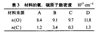 從表中可看出,D材料與前3種材料的碳,氧含量無大的差別。因而,導(dǎo)致前述差異的原因可以排除氧,碳雜質(zhì)含量的不同??赡艿脑蚴茿,B,C3種材料中金屬雜質(zhì)含量較多,高溫過程促進了金屬雜質(zhì)與氧、碳沉淀的結(jié)合,使原本"潔凈"的沉淀成為有效的復(fù)合中 心,從而使高溫吸雜達不到其應(yīng)有的目的.另外,這一差異也可能是材料中不同生長缺陷在高溫過程中發(fā)生不同演化造成的.