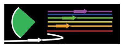 圖1:波分復(fù)用解復(fù)用器的抽象視圖。在轉(zhuǎn)換成電信號前,中階梯光柵對帶不同波長光的許多平行信道的一條輸入信道進(jìn)行分離。
