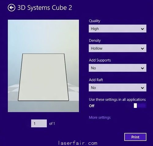 當(dāng)用戶通過Windows 8.1打印3D模型時,在他們看來,整個過程就像打印Word文檔一樣簡單。在創(chuàng)建了3D模型之后,用戶便可以從Charms bar進入Device Charm。接下來,用戶可以從一個列表中選擇具體的3D打印機,隨后列表會列出所有打印選項,在點擊或觸碰“打印”按鈕,啟動3D打印程序之前,用戶還可以對這些選項進行調(diào)整。