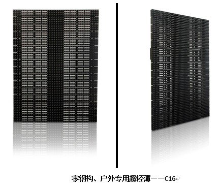 而C16是一款戶外固裝LED顯示屏,可直接替換傳統(tǒng)噴繪廣告牌,無需更換鋼結(jié)構(gòu)。20kg/箱體,最薄處32mm,屏體重量降低32%;IP65/IP65高防護(hù)等級,實(shí)現(xiàn)戶外裸裝;透風(fēng)透光設(shè)計(jì),滿足高層建筑樓頂樓面廣告牌的不同需求;無風(fēng)扇,無空調(diào),自行散熱,節(jié)省成本和運(yùn)營費(fèi)用20%以上。