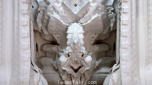 漢斯梅耶爾最初計(jì)劃用普通3D打印材料(如高分子塑料)來進(jìn)行創(chuàng)作,但在經(jīng)過嘗試之后,設(shè)計(jì)中的許多細(xì)節(jié)不能通過這些材料展示出來,他們甚至還得為此而減小作品的尺寸,很顯然這將會違背漢斯梅耶爾的創(chuàng)作初衷。隨后,設(shè)計(jì)團(tuán)隊(duì)決定利用砂巖加高強(qiáng)度的粘合劑來充當(dāng)打印材料,這一組合不僅能夠讓作品維持原有的設(shè)計(jì)尺寸,同時(shí)還可以把作品的細(xì)節(jié)完美呈現(xiàn)出來。“最終我們在設(shè)計(jì)和材料之間找到了微妙的平衡,”漢斯梅耶爾說道,“雖然設(shè)計(jì)和打印用了很長時(shí)間,但我們還是創(chuàng)作出了這件有史以來構(gòu)造最為復(fù)雜的建筑。”