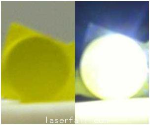 左邊是沒照明的熒光體.右邊明亮的白色光是激光和熒光體相結(jié)合產(chǎn)生的。