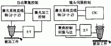 (5) 激光頭可自由運動,目前激光頭已達5個運動軸,即使工件在加工時保持固定,仍可實現(xiàn)復(fù)雜工件的加工,而且只要利用移動旋轉(zhuǎn)工作臺,就可加工比軸行程大的零部件。激光束采用自動聚焦控制。激光系統(tǒng)直線軸可沿光軸或任意軸定位,以保持光束聚焦;焦點位置任何時刻都精確可知,而且行程無限制。圖1示出了自動聚焦控制與鏡頭伺服控制的比較,由圖看見,鏡頭伺服系統(tǒng)中聚焦透鏡與激光系統(tǒng)移動無關(guān),因此焦點位置無法確定。