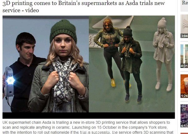 據(jù)臺(tái)灣東森新聞網(wǎng)報(bào)道,英國知名連鎖超市Asda最近在約克試辦一項(xiàng)另類服務(wù),他們運(yùn)用最新的3D打印科技,替客人印制出和本尊一模一樣的模型,起價(jià)40英磅(約合人民幣394元),活動(dòng)推出后立即掀起風(fēng)潮,目前預(yù)約的訂單早已額滿。Asda表示,若反應(yīng)熱烈,明年會(huì)正式推出服務(wù)。