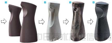 6 為根據(jù)3D打印機輸出的實物模型(后方)燒制試制品,備前燒陶吉方面制作了陶胚(前方)
