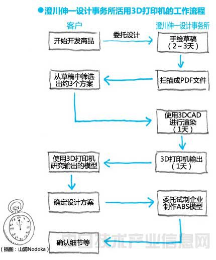 澄川向客戶提供設(shè)計時,采用的工作流程如下圖所示。除了使用手繪草稿、3DCAD和CG渲染、購置的3D打印機輸出的模型,以及委托試制企業(yè)制作的模型驗證自身設(shè)計,3D打印機的用途還包括明確客戶的判斷、相互交流等。