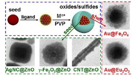 3、納米種子的分散與聚集過(guò)程,研發(fā)出了一種將氧化鋅半導(dǎo)體包裹在不同種子(包括金屬、氧化物、聚合物納米顆粒,氧化石墨烯以及碳納米管)表面的普適方法。并且,這種方法不僅局限于以氧化鋅為外殼,還適用于以其他的氧化物或者硫化物為外殼,比如Fe3O4, MnO, Co2O3, TiO2, Eu2O3, Tb2O3, Gd2O3, beta-Ni(OH)2, ZnS,以及CdS等,來(lái)合成復(fù)合物核殼納米結(jié)構(gòu)。