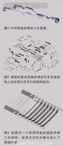 級(jí)進(jìn)模沖壓和滾軋成形是兩種最有效率的成形工序,當(dāng)它們與帶卷拼焊技術(shù)結(jié)合起來(lái)以后,可以大幅降低沖壓成本和部件重量。這一技術(shù)也會(huì)提高串聯(lián)式拉延的效率(用單個(gè)的板料進(jìn)行喂料時(shí)的效率一般較低)。帶卷拼焊技術(shù)已經(jīng)在超過(guò)45種汽車(chē)車(chē)身部件的生產(chǎn)中得到應(yīng)用,例如車(chē)頂彎梁、頂蓋橫梁、立柱加強(qiáng)板、橫梁、前圍、座椅板以及排氣系統(tǒng)的部件,如果這45種都應(yīng)用的話(huà)可以減少35公斤的重量。