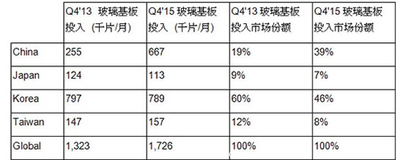 日本8代線玻璃基板投入產(chǎn)能有小幅下降,從2013年四季度的每月12萬片到2015年四季度的每月11萬片,主要原因是夏普正將其Kameyama28代工廠轉(zhuǎn)變成Oxide(金屬氧化物)工廠以進行高分辨率的移動裝置用面板生產(chǎn)。