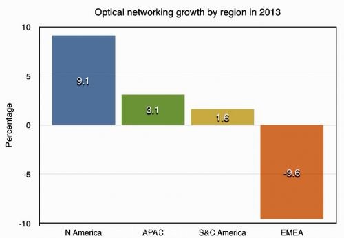 相比之下,在EMEA地區(qū),2013年光網(wǎng)絡(luò)市場(chǎng)則萎縮了近10%。由于在歐洲沒有相應(yīng)費(fèi)用的開支,是導(dǎo)致EMEA地區(qū)市場(chǎng)下降的主要原因。