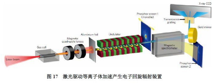 激光等離子體加速器在驅(qū)動(dòng)產(chǎn)生強(qiáng)輻射源方向有重大優(yōu)勢(shì),如圖17所示,將電子束通過(guò)磁波蕩器時(shí),將產(chǎn)生可見(jiàn)光及軟X射線波段輻射,F(xiàn)uchs等(Nature Phys. 5, 826~829(2009))將200MeV的電子通過(guò)波蕩器產(chǎn)生了17nm和9nm波長(zhǎng)的輻射,峰值亮度為1.3×1017s-1mard-2mm-20.1%BW-1。此外,激光尾場(chǎng)內(nèi)橫向電場(chǎng)對(duì)電子振蕩的調(diào)制作用也將發(fā)射較強(qiáng)的短波輻射,即電子回旋振蕩輻射。Kneip等測(cè)量250MeV電子回旋振蕩發(fā)射1~100keV的X射線輻射,并在10keV處產(chǎn)生1×1022PSB峰值亮度(Nature Phys. 6,980~983(2010))。