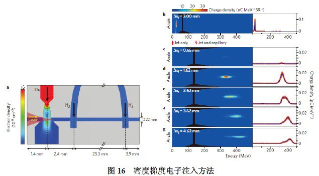 該方案為兩束相向傳輸?shù)募す饷}沖,波數(shù)和頻率分別為k1,2,ω1,2,調(diào)制激光場(chǎng)為cos(1/2(Δkz-Δωt))。如圖14(b)所示,當(dāng)Δω=ωp時(shí),等離子體波將共振激發(fā)。 1993年,加州洛杉磯大學(xué)首次驗(yàn)證了PBWA方案電子加速,實(shí)驗(yàn)采用70J,300ps激光脈沖將高頻射線槍產(chǎn)生的2.1MeV的電子加速到9.1MeV(Phys. Rev. Lett. 70, 37~40(1993))。PBWA機(jī)制本身存在著局限性:隨著等離子體波幅度的增長(zhǎng),電子相對(duì)論質(zhì)量的增加導(dǎo)致等離子體頻率下降,導(dǎo)致激波失諧以及等離子體波的幅度飽和,該效應(yīng)限制了該方案的進(jìn)展。