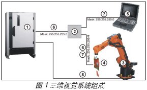 三維視覺系統(tǒng)主要由以下幾大部分組成,它通過ETHERNET IP協(xié)議與機(jī)器人控制器進(jìn)行通訊,連接方式如下圖所示。