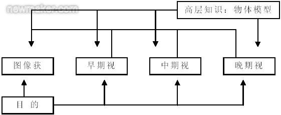 可以說.對三維掃描儀機(jī)器視覺的全球性研究熱潮是從20 世紀(jì)80 年代開始的,到了80年代中期,機(jī)器視覺獲得了蓬勃發(fā)展,新概念、新方法、新理論不斷涌現(xiàn)。有學(xué)者對計(jì)算機(jī)視覺理論的發(fā)展提出了不同的意見和建議。對Marr 的理論框架作了種種的批評和補(bǔ)充,綜合這些意見及補(bǔ)充可得如圖2 所示的框架。