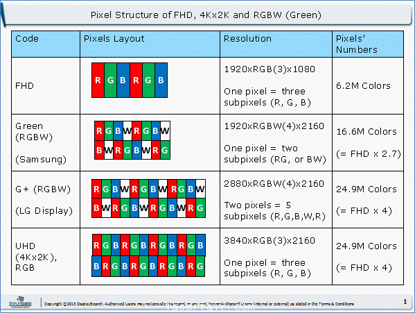 三星電子表示其Green UHD面板的優(yōu)勢(shì)有:(1)更好的透光率,更高的開口率;(2)減少能源損耗;(3)降低驅(qū)動(dòng)IC和T-Con(時(shí)序控制器)的成本;(4)減少背光模塊的使用;(5)降低電視系統(tǒng)成本。NPD DisplaySearch分析這種RGBW式的4K具有以下幾種特點(diǎn):