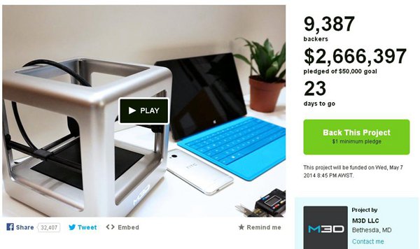 上周3D打印行業(yè)的明星毫無疑問應該是一臺名為Micro的消費級3D打印機。2014年4月7日,這款小巧的3D打印機剛開始在眾籌平臺Kickstarter上的募款目標只有微不足道的5萬美元。但令人驚訝的是,這個目標在其剛上線不到11分鐘即告突破。不過令人吃驚的還在后面,2014年4月14日,差不多一周時間,Micro 3D打印機的募集資金已經達到了驚人的260萬美元!