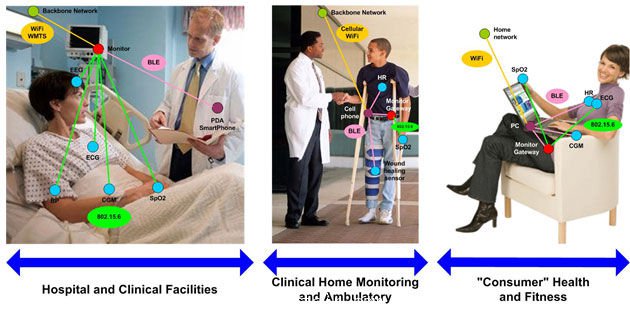 WPAN占有個(gè)人周圍的網(wǎng)絡(luò)空間,覆蓋了附近的生活或工作空間( 通??蛇_(dá)十米),并采用藍(lán)牙和Zigbee等協(xié)議來實(shí)施。WBAN則占有更小的無線空間,在人體周圍大約一米,用于與人體相關(guān)的傳感器通信。應(yīng)用已從大量的工作周期性點(diǎn)測擴(kuò)展到更多數(shù)據(jù)密集的連續(xù)鏈接。在醫(yī)院和臨床設(shè)施、臨床家庭監(jiān)護(hù)和非臥床應(yīng)用、以及消費(fèi)者健康和健身中,這項(xiàng)技術(shù)有著多種應(yīng)用(參見圖5)。