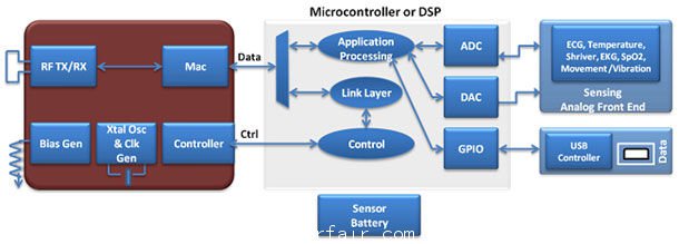 小心平衡這些取舍的一個(gè)示例就是美高森美的ZL70250收發(fā)器(參見圖7),該器件在尺寸大約2mm x 3mm的芯片級(jí)封裝內(nèi),具有標(biāo)準(zhǔn)的2線和SPI接口,可使用任何標(biāo)準(zhǔn)微控制器進(jìn)行控制和數(shù)據(jù)傳送。該微控制器的模數(shù)轉(zhuǎn)換器(ADC)連接至超低功耗模擬前端器件,連同ZL70250收發(fā)器,所構(gòu)成的解決方案可用于開發(fā)無線ECG解決方案,采用CR系列紐扣電池可以連續(xù)運(yùn)行長達(dá)一周時(shí)間。此類器件,比如用于病患呼吸測量的3軸加速計(jì)或脈搏血氧計(jì)(pulse-oximeter)、以及各種其它可穿戴式健康監(jiān)控平臺(tái),都可以達(dá)到類似的功率效率。此類器件使低成本紐扣電池或小型鋰離子電池在更換前能夠支持長達(dá)兩周時(shí)間的連續(xù)WPAN和WBAN數(shù)據(jù)流。