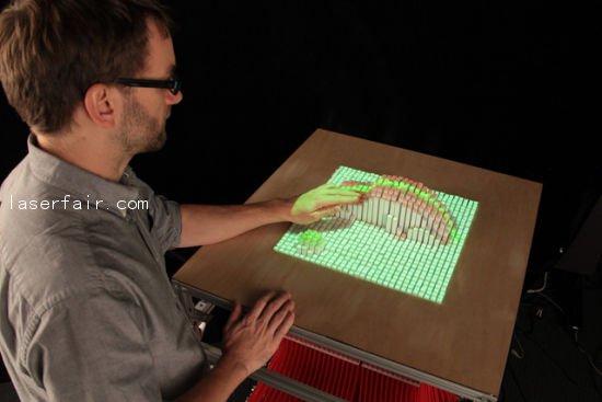 inFORM是由麻省理工大學(xué)主持研究的一個(gè)科研項(xiàng)目,利用Kinect 傳感器、針幕、投影儀和相關(guān)的聯(lián)動(dòng)裝置組成的3D 動(dòng)態(tài)交互系統(tǒng)。這個(gè)系統(tǒng)打破了“互動(dòng)化將走向虛擬不歸路”的言論,“針幕”的每一根“針”都跟一個(gè)數(shù)控馬達(dá)連在一起。“針幕”就是 inFORM 的輸入屏幕(同時(shí)也是輸出器件),只不過它實(shí)現(xiàn)的是一種可見可觸的真實(shí)塑形功能。無論現(xiàn)場還是遠(yuǎn)程, inFORM 都允許用戶通過控制“針幕”上針的起伏塑造動(dòng)態(tài)的 3D 模型,或者通過“針幕”運(yùn)動(dòng)帶動(dòng)物體運(yùn)動(dòng)。其實(shí),按照字面意思也不難理解,inFORM是一種參與成型的可視化過程。