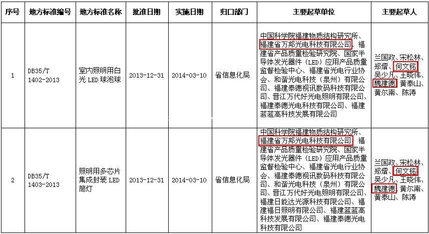 近日從福建省質(zhì)量技術(shù)監(jiān)督局獲悉,由福建省萬(wàn)邦光電科技有限公司(簡(jiǎn)稱萬(wàn)邦光電)總經(jīng)理何文銘、副總經(jīng)理魏建德參與編制的兩項(xiàng)福建省地方標(biāo)準(zhǔn)《室內(nèi)照明用白光LED球泡球...
