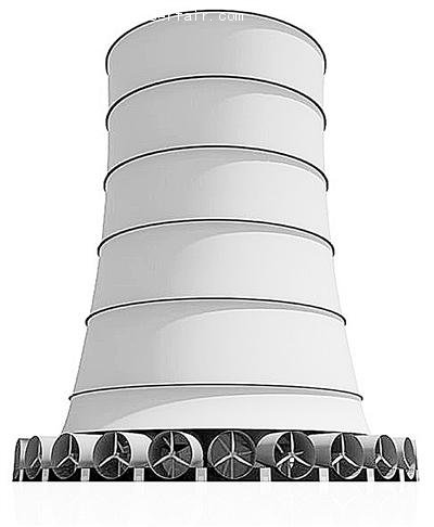 這座塔位于炎熱干燥的地區(qū)。其結(jié)構(gòu)是一個(gè)聳入云端的中空?qǐng)A柱體,頂部開口以便驕陽(yáng)炙烤過的干熱空氣進(jìn)入。旁邊設(shè)有噴水系統(tǒng),可將水泵提送上來的水形成水霧噴灑到塔頂?shù)拈_放區(qū)域。當(dāng)水分遇上干燥的空氣之后蒸發(fā),空氣迅速變冷,比重增加,由此形成垂直下沉的氣流,速度可達(dá)約50英里/小時(shí)。