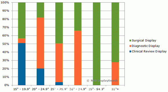 隨著放射性程序日益復(fù)雜,需要更多時(shí)間從顯示到讀取圖像,這將帶動(dòng)影像診斷顯示器(diagnostic display)的成長(zhǎng)。其中21.3”的顯示器已經(jīng)占有67%的市場(chǎng)率,并繼續(xù)主導(dǎo)此一類別的發(fā)展。然而由于特殊的面板和背光的需求,只有少數(shù)廠家才有能力參與這個(gè)利基市場(chǎng)。不過這些廠家以一些舊的低效率的產(chǎn)線進(jìn)行生產(chǎn),產(chǎn)能有限。因此生產(chǎn)這些面板的成本將會(huì)高于消費(fèi)性面板,樂觀地來(lái)看平均價(jià)格相對(duì)穩(wěn)定。
