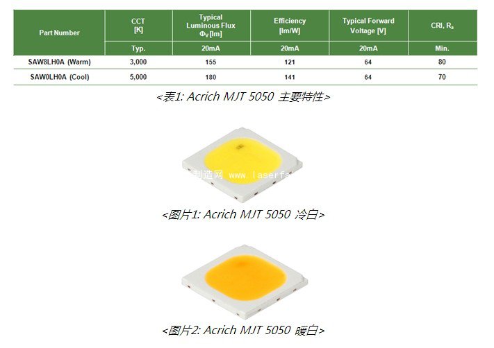 創(chuàng)新戶外照明Acrich LED,亮度最高可達440lm,性價比提升40%,且具有高信賴性,適合應用在對大功率和性價比有較高要求的戶外照明上,如路燈、工礦燈。全球知名LED生產(chǎn)廠商-首爾半導體(代表理事:李貞勛,www.seoulsemicon.co.kr)5月26日表示,正式推出能滿足所有高亮度、高信賴性、高性價要求的創(chuàng)新戶外照明用LED- Acrich MJT 5050。封裝尺寸為5.0mm X 5.0mm,電流200mA下,冷白亮度180lm(typ),電流最大到60mA時,亮度可達440lm(typ)。