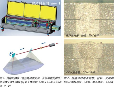 在實際的生產(chǎn)中使用兩套系統(tǒng),均具有非常高的生產(chǎn)率。典型激光功率為4-6kW,焊接速度為4-10m/分鐘。固定式掃描儀能夠掃描最大尺寸為1.4m x 3m的工作區(qū)域,掃描儀的焦距為1.6m(圖1)。
