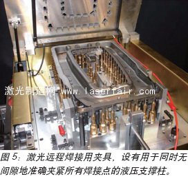 進(jìn)行激光遠(yuǎn)程焊接時,主要焊接搭接接頭。對于高質(zhì)量的焊接,在夾緊連接件時,夾緊方式應(yīng)確保焊接件之間無空氣間隙或?qū)⒖諝忾g隙降到最小。必須使用相同方式,以便能夠在所有焊接部位確保無縫隙(cero gap)的夾具。該應(yīng)用領(lǐng)域中打開狀態(tài)下的標(biāo)準(zhǔn)液壓夾具如圖5所示。關(guān)閉蓋子既可夾緊,激光光束通過蓋子上的各孔進(jìn)入。