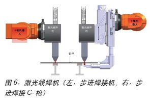 具有C-槍的激光線焊機(jī)(LSS)安裝在伺服電機(jī)驅(qū)動的橫移裝置上。這與設(shè)有補(bǔ)償模塊的電阻焊接槍類似(見圖6右)。這種型號工業(yè)機(jī)器人(80kg輸送能力)將LLS移入焊接位置,并以可編程的力關(guān)閉。