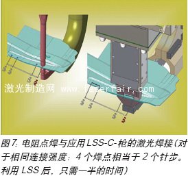 目的是通過一條大約30-40 mm的激光步進(jìn)焊縫兩個大約30 mm典型距離的焊接點。例如,如果是30個電阻焊接點,循環(huán)時間大約為75秒。如果以所述方式用激光焊接代替點焊,只需要15條激光焊縫。循環(huán)時間能夠減少,總共只需要37秒。意味著生產(chǎn)率和大幅精簡所需生產(chǎn)系統(tǒng)兩個因素。即使單臺LSS的成本比單臺點焊槍的高,也能夠達(dá)到節(jié)約占地面積和減少投資的目的。