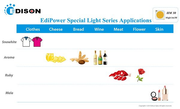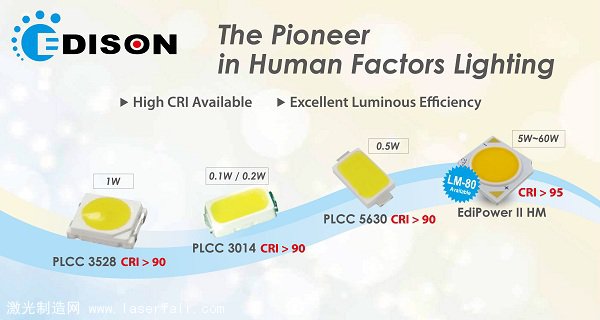研究指出光源的強(qiáng)度及顏色會(huì)對(duì)人類的心理及生理健康造成影響,LED因具有高演色性及光色可調(diào)的特性,可依人體需求提供舒適的照明環(huán)境,艾笛森 光電以發(fā)展人因照明為目標(biāo),陸續(xù)推出多款高CRI產(chǎn)品,以PLCC封裝形式為例,目前3014(01瓦/0.2瓦)、5630(0.5瓦)及3528(1 瓦)CRI皆已超過90,而以高光效著稱的EdiPower II HM系列更將規(guī)格提升至CRI 95以上,不僅可應(yīng)用于居家照明及商業(yè)照明,亦可滿足對(duì)光源顯色效果要求極高的博物館及醫(yī)院照明。
