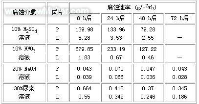 用線切割方法切取涂層和基體材料同上的激光熔覆和等離子噴焊試塊各4塊,分別在不同溶液中進行腐蝕試驗。腐蝕溶液置于溫度為60℃的水浴槽中保溫,腐蝕后用精密分析天平稱量其失重量,試驗結果和分析數(shù)據(jù)見表2。由試驗數(shù)據(jù)分析可得出結論:激光熔覆工藝試片在H2SO4、HNO3、NaOH和尿素4種溶液介質(zhì)中的腐蝕速率均低于等離子噴焊工藝試片,具有優(yōu)良的綜合抗腐蝕性能。在H2SO4、HNO3 2種溶液中的對比尤為明顯。