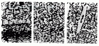 由能譜儀對熔層的成分分析表明,激光熔層成分被基體Fe的稀釋率為等離子噴焊層的1/3,電弧堆焊層的1/14。由圖1、圖2、圖3可見激光熔層晶粒細小,與基體的互熔結合區(qū)細窄,說明熱作用時間短,對基體熱影響小,熔層與基體元素互擴散小,有效地保證了熔層設計成分不被基體稀釋,不向基體擴散。由此可見,激光熔層能有效地保留預設計的合金成分,并發(fā)揮其優(yōu)良性能。