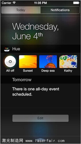 智能LED燈泡制造商飛利浦昨(5)日預(yù)告他們計(jì)劃在iOS 8通知中心整合一個(gè)可以控制飛利浦智能LED燈泡的部件,并公布預(yù)覽截圖。飛利浦在Twitter上公布的圖片只是一個(gè)概念原型,但它確實(shí)表明了該公司正在開發(fā)支持未來iOS 8移動(dòng)操作系統(tǒng)新的widget功能。這個(gè)概念圖顯示了一個(gè)專用的Hue小部件,上面帶有“全部關(guān)閉”按鈕,以及三個(gè)光線“場(chǎng)景”,用戶可以從通知中心快速選擇。