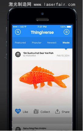 通過MakerBot Mobile,用戶可以直接登錄在線模型庫Thingiverse并收藏自己中意的3D設(shè)計,或者輕松上傳自己3D打印作品的圖像并在社交網(wǎng)絡(luò)中分享。如果有別人下載、3D打印了您的設(shè)計,或者上傳了根據(jù)您的設(shè)計文件打印出的作品的圖片,MakerBot Mobile也會實時通知您。