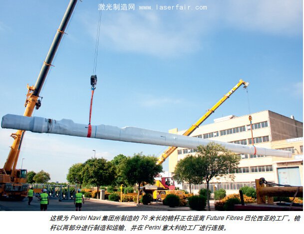 該76 米長的桅桿經(jīng)過了18 個月的設計、開發(fā)和建造,于2013 年的9 月最后完成,是為一艘Perini Navi 集團60米長的單桅帆船生產(chǎn)的。Future Fibres公司還將為這艘船只提供卷帆桿以及專門定制的整套復合材料索具。