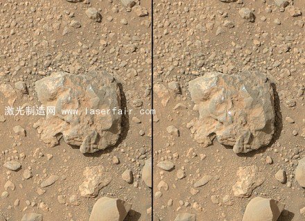 7月12日,好奇號(hào)火星車對(duì)這塊稱為新星(Nova)的巖石,實(shí)施了空中激光打擊,正中間為空襲目標(biāo),用以分析目標(biāo)巖石化學(xué)組成。左側(cè)為空襲前,右側(cè)為空襲后畫(huà)面。