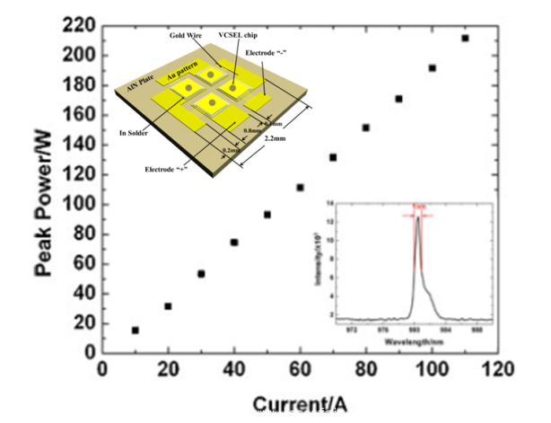 中國科學(xué)院長春光學(xué)精密機(jī)械與物理研究所大功率激光研究組開發(fā)出了利用4個(gè)高功率垂直腔面發(fā)射半導(dǎo)體激光器(VCSEL)單管串接形成的百瓦級980nm波段高功率準(zhǔn)列陣模塊。該模塊采用全自主化設(shè)計(jì)的芯片結(jié)構(gòu)及模塊結(jié)構(gòu),模塊尺寸僅有2.2mmX2.2mm,輸出功率高達(dá)210W,這是單管VCSEL模塊迄今為止所報(bào)道的最高功率指標(biāo)。該突破使得微小型高功率VCSEL模塊有望在激光引信、激光測距及激光面陣?yán)走_(dá)系統(tǒng)中實(shí)現(xiàn)實(shí)用化。