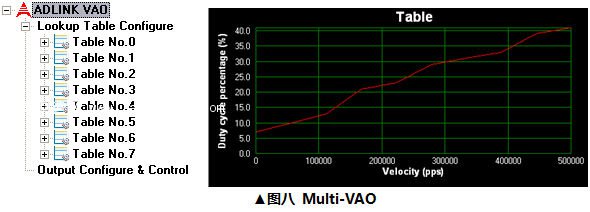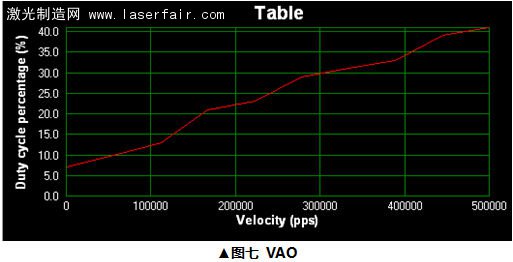 傳統(tǒng)運(yùn)動(dòng)控制卡的PWM控制,均采用Duty單一控制方式,且通過軟件控制,會(huì)面臨無法實(shí)時(shí)且穩(wěn)定控制PWM的時(shí)序。為了應(yīng)對(duì)不同速度與不同圖形,新一代運(yùn)動(dòng)控制卡采用更多種控制方式,包含頻率調(diào)變(Frequency Modulation)、帶寬調(diào)變(duty Modulation)、混合調(diào)變(Blend Modulation),如圖六所示,此控制方式會(huì)由硬件控制來完成,此PWM能在各種切割速度下呈現(xiàn)出不同能量的表現(xiàn),因此需建立一對(duì)應(yīng)的能量表,以防止發(fā)生『過融現(xiàn)象』,此能量控制就稱(VAO),如圖七所示。