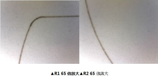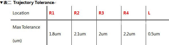 因加工是由4,500個(gè)小線段所組成的圖形(如圖十三),并特別取得四個(gè)彎角段及四段長(zhǎng)直線段的誤差數(shù)據(jù)(如表二),而整體激光加工的彎角軌跡誤差小于2.2um,長(zhǎng)直線端的軌跡誤差更小于0.5um。 通過以下區(qū)域放大圖片中,可清楚的看到激光能量是均勻地控制在一定范圍,并顯示實(shí)際加工軌跡是平滑無抖動(dòng)。也由此可左證凌華科技新一代的運(yùn)動(dòng)控制卡不僅能實(shí)現(xiàn)一般多軸插補(bǔ)運(yùn)動(dòng),同時(shí)可實(shí)現(xiàn)在如激光切割等復(fù)雜的圖形加工。而板上所實(shí)現(xiàn)的實(shí)時(shí)激光強(qiáng)度與回饋速度追隨,更可有效節(jié)省系統(tǒng)CPU資源,并保證其加工效能。