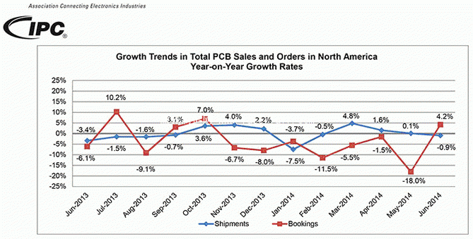 2014年6月份北美地區(qū)PCB行業(yè)的總出貨量,同比下降0.9%,年初至今的出貨量增長為-0.3%。與上月相比,PCB出貨量,環(huán)比增長9.1%。