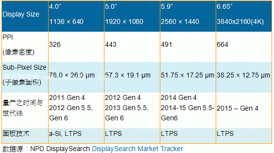 NPD DisplaySearch 觀(guān)察到, 目前雖然4K 電視隨處可見(jiàn), 但以智能手機(jī)與智能平板等移動(dòng)裝置面板而言, 要達(dá)到超高分辨率與絕對(duì)分辨率相比,像素密度(Pixel Per Inch, PPI)為面板制造帶來(lái)的困難更多。