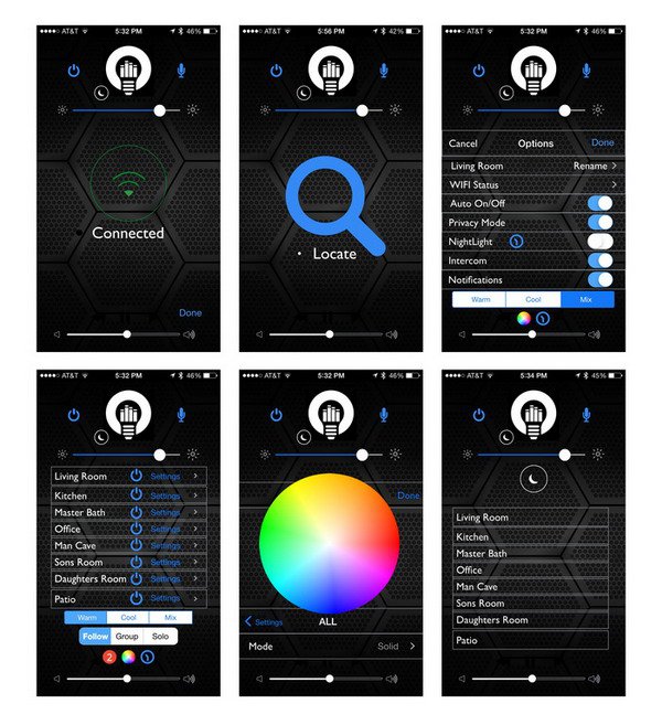 用WiFi方式時,最多能讓50只LightFreq同時發(fā)聲;用藍(lán)牙的話,最多同時讓2只燈泡發(fā)聲,所以立體聲和環(huán)繞聲音樂都能通過它播放,內(nèi)置的Follow Me功能很有意思,只要你帶著運(yùn)行配套APP的智能設(shè)備在屋子里走動,燈光和音響就會自動跟著你從一個房間到另一個房間。燈光還會根據(jù)你所聽音樂的風(fēng)格,比如嘻哈,搖滾,或電子音樂,自動切換到合適的顏色,以及變色的速度頻率,起到烘托氛圍的作用。