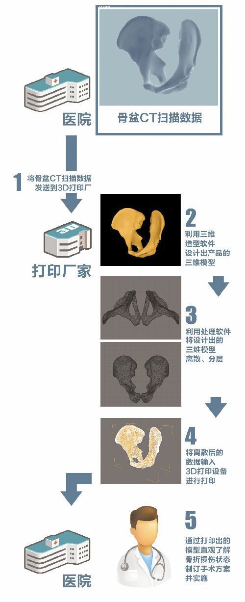 張錫平說(shuō),他們首先將小軍的骨盆CT掃描數(shù)據(jù)處理后發(fā)送到3D打印廠打印出1:1比例的骨盆模型。這個(gè)骨盆模型,與小軍體內(nèi)的一模一樣,包括受傷的位置。“通過(guò)模型,我們能非常清楚的了解骨折的類型、移位程度及方向。”