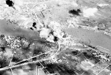 14時(shí),激戰(zhàn)全面打響,地面上北越的高射炮猛烈開火,在天空中綻放出無數(shù)深褐色煙團(tuán),執(zhí)行掩護(hù)任務(wù)的美軍F-100機(jī)群則迅速向地面的高射炮陣地射出火箭彈。與此同時(shí),第一個(gè)攜帶AGM-12導(dǎo)彈的F-105四機(jī)編隊(duì)在里斯奈爾中校率領(lǐng)下從南面猛撲清化大橋。正午的陽光照在河面上,使大橋周圍籠罩上一層霧氣,但里斯奈爾仍然準(zhǔn)確瞄準(zhǔn)中央橋墩打出第一枚導(dǎo)彈。當(dāng)他重新將飛機(jī)拉平時(shí),橋梁中部閃出一團(tuán)火光,導(dǎo)彈擊中目標(biāo)。之后,攜帶導(dǎo)彈的美軍飛機(jī)連續(xù)向大橋發(fā)射導(dǎo)彈……據(jù)事后調(diào)查,有32枚AGM-12導(dǎo)彈命中大橋,但要么因彈著點(diǎn)不夠理想,要么因爆炸威力不夠,這些導(dǎo)彈并未能摧毀大橋。